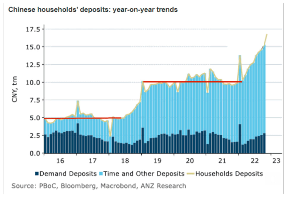 Собственно, это размер депозитов китайских домохозяйств. Темным цветом вклады до востребования, светлым - срочные депозиты. Вот такие бережливые эти китайские ребята. Появляется денюжка - на депозит.