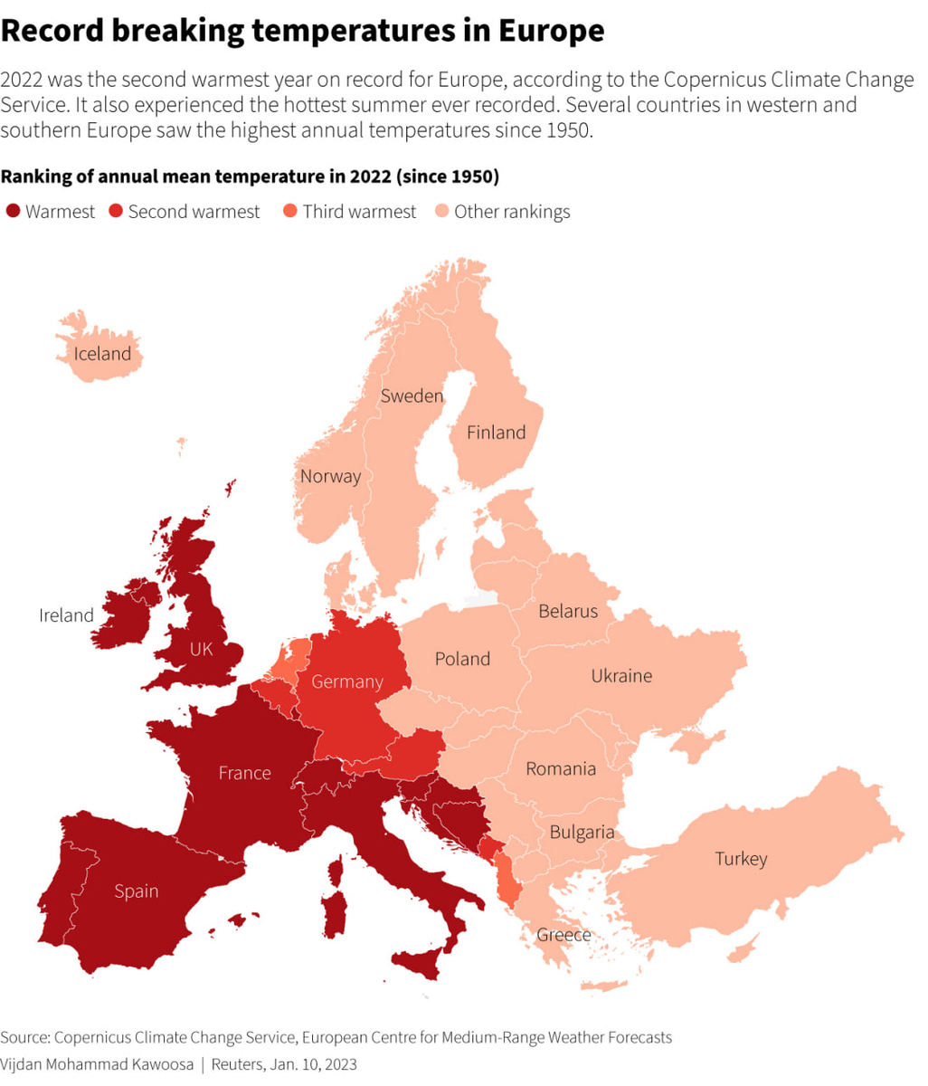 Цветом выделены страны в которых среднегодовая температура побила рекорды с 1950 года. Это самые бордовые. Красненькие - это второе место за этот период наблюдений. Ну и т.д.