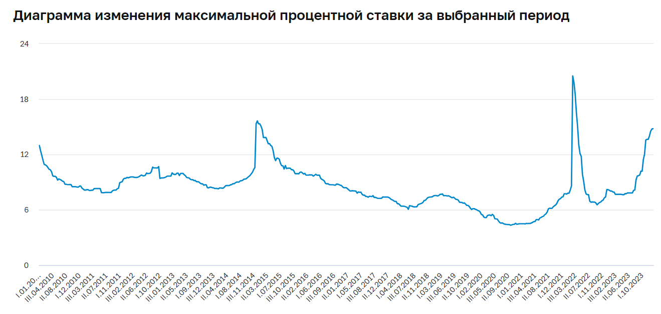 На первую декаду января 2024 ставка составляет 14,793%