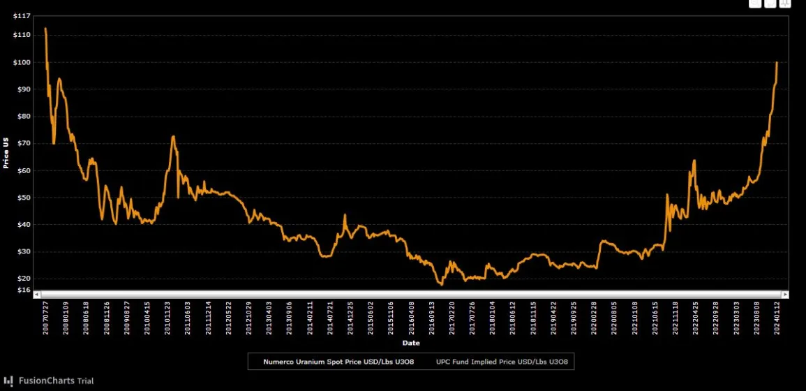 Спотовая цена на уран, жизненно важный для заправки ядерных реакторов, поднялась в понедельник чуть более чем до 103 долларов за фунт, уровня, невиданного с 2007 года, согласно графику Numerco.