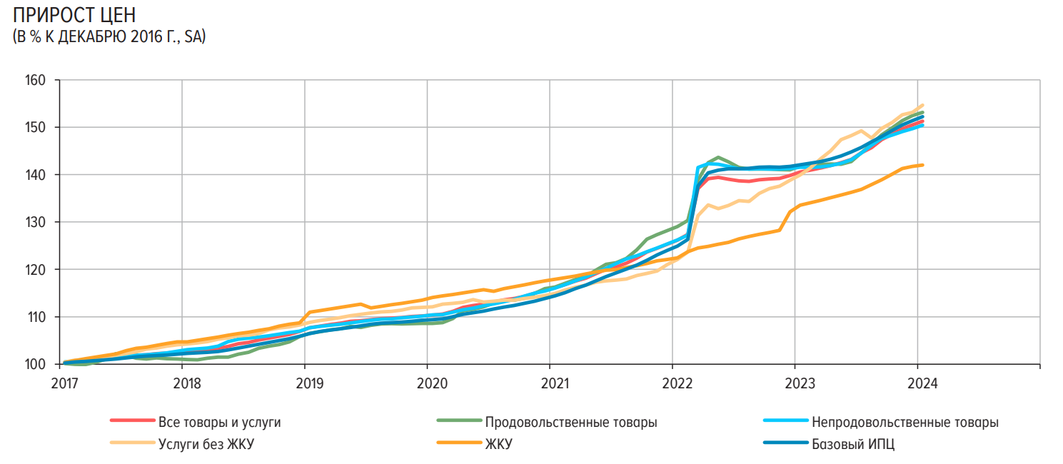 А на картинке вы можете ознакомиться с приростом цен на текущий момент к декабрю 2016 года. Получаем, что за 7 лет по всему спектру товаров и услуг рост цен составил чуть выше 50%