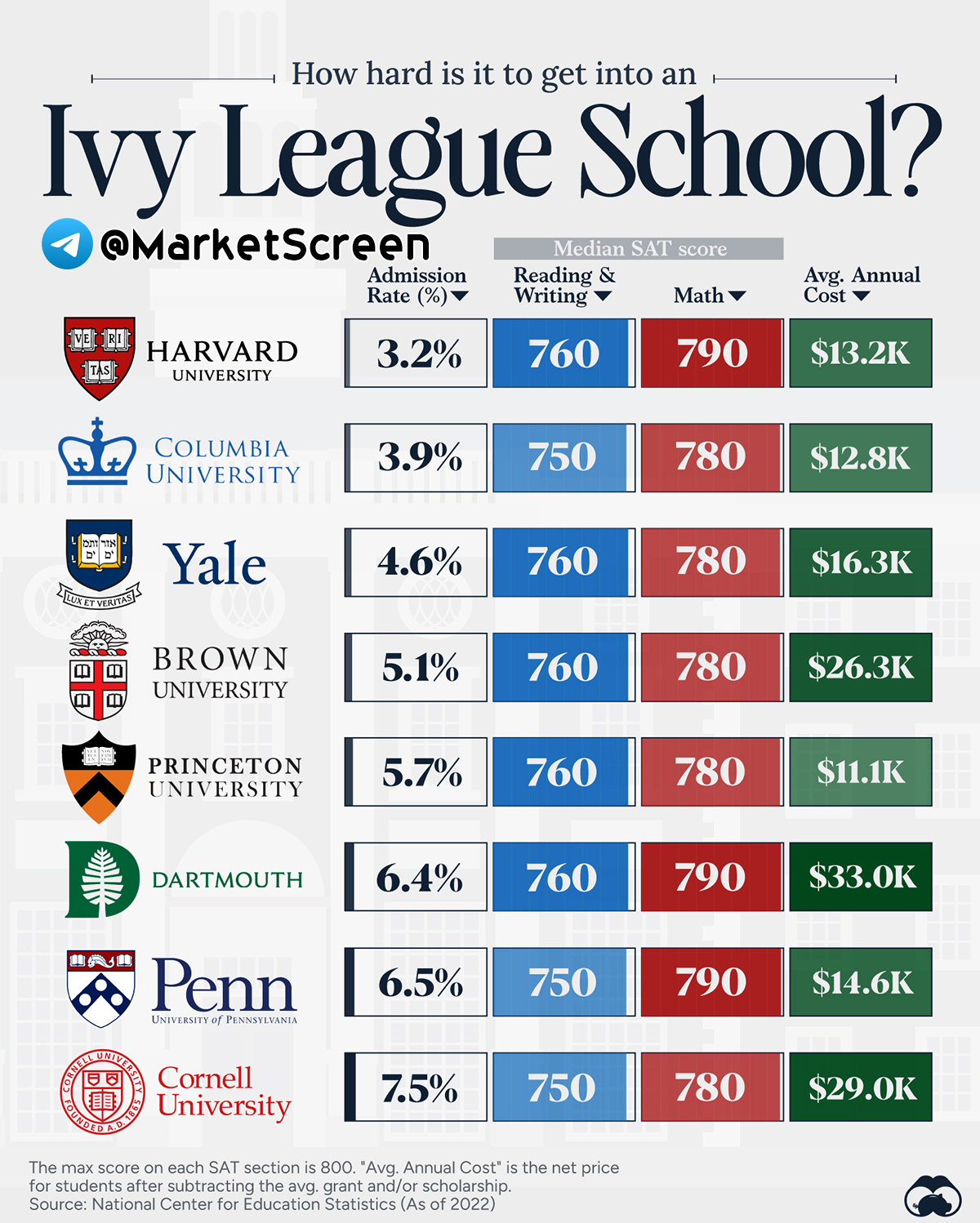 Обратите внимание, что “среднегодовая стоимость” представляет собой чистую цену, которую платит студент после получения федеральной финансовой помощи. Если пойти в эти волшебные заведения с улицы, то за плечами надо хорошего папу заиметь. Мы год назад писали про стоимость обучения в подобных заведения, освежить память можно тут: https://t.me/marketscreen/6517