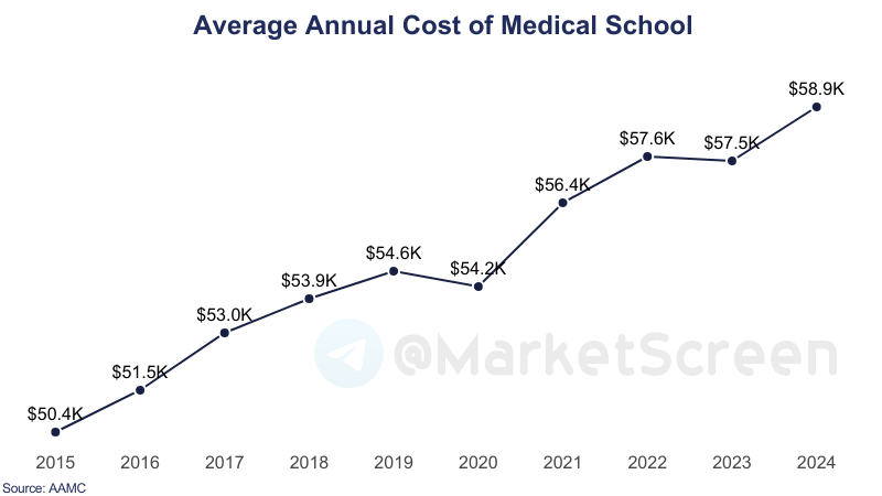 Стоимость обучения на медика растёт на 2,5% ежегодно. Средняя цифра на текущий момент за получение образования - 235 827$ или 58 968$ в год.