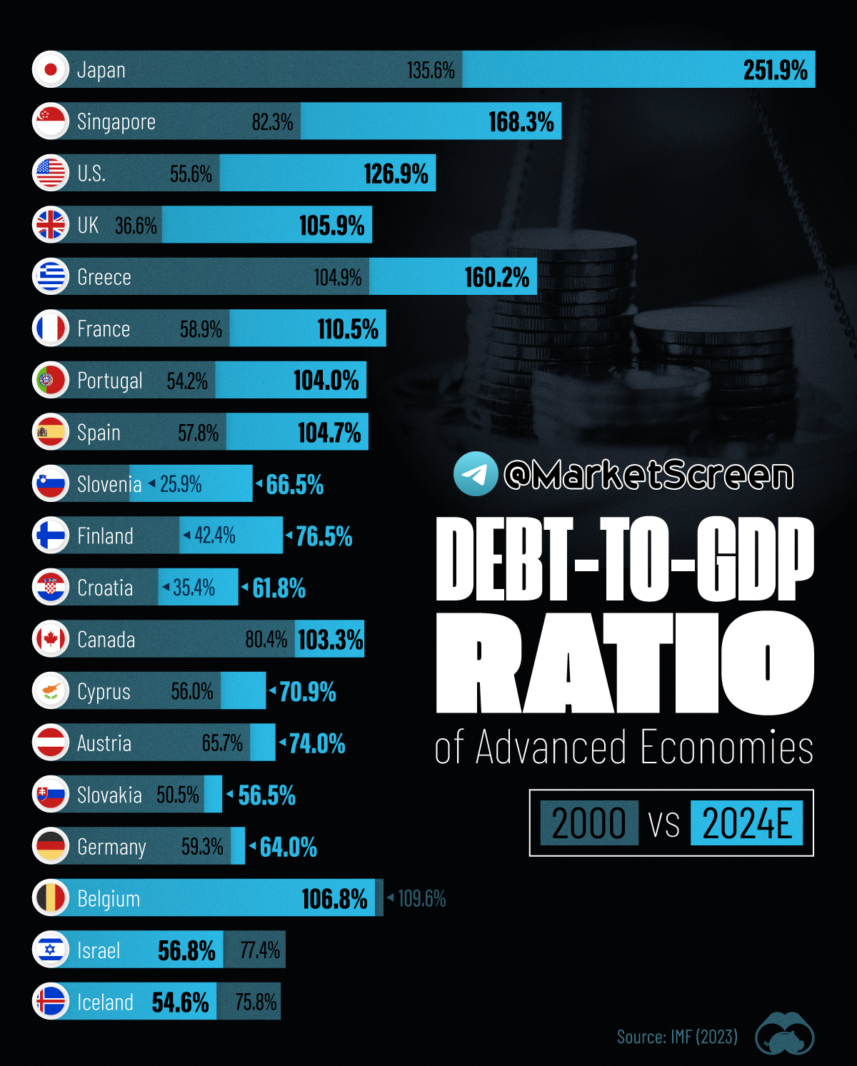 Тут вот такую инфографику запилили. Тёмная часть гистограммы - это уровень госдолга к ВВП страны в 2000 году, а яркая светлая часть - в 2024 (прогноз).