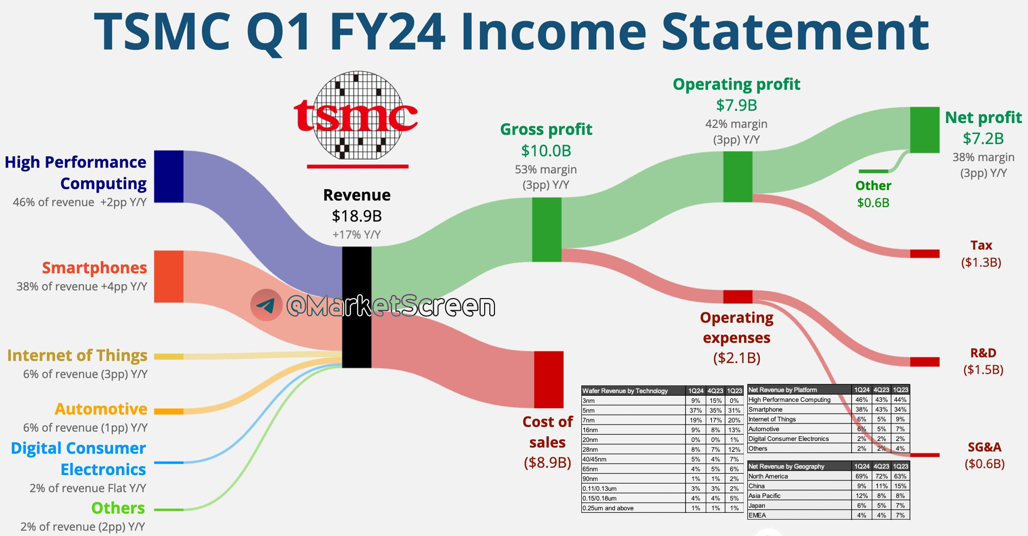 Тут главный чипмейкер тайваньский отчитался. Заработал за квартал 7,2 млрд $ чистых денег. Основной приток от высокопроизводительных компьютеров и смартфонов.