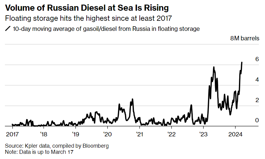 Пишут, количество нашего с вами дизельного топлива, находящегося в настоящее время в танкерах в открытом море, бьет исторические рекорды. Всё это говорит о том, пишет Bloomberg, что Москве просто некуда их продать (но это не точно).