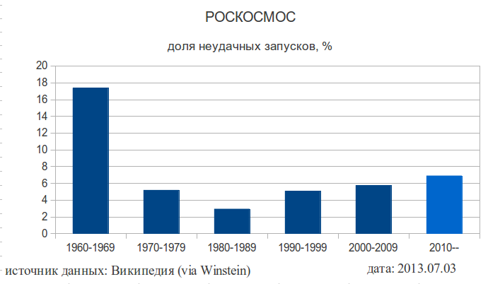 Я взял ваши данные из таблицы, и сделал график как в посте по ссылке. По динамике практически тоже самое получилось что и там. В 60-ых много ракет падало, так как технология еще в младенчестве находилась. Потом обкатали технологию, и неудачных запусков было очень мало. А после развала СССР началось постепенное разрушение космической отрасли, которое стабильно продолжается и сейчас.