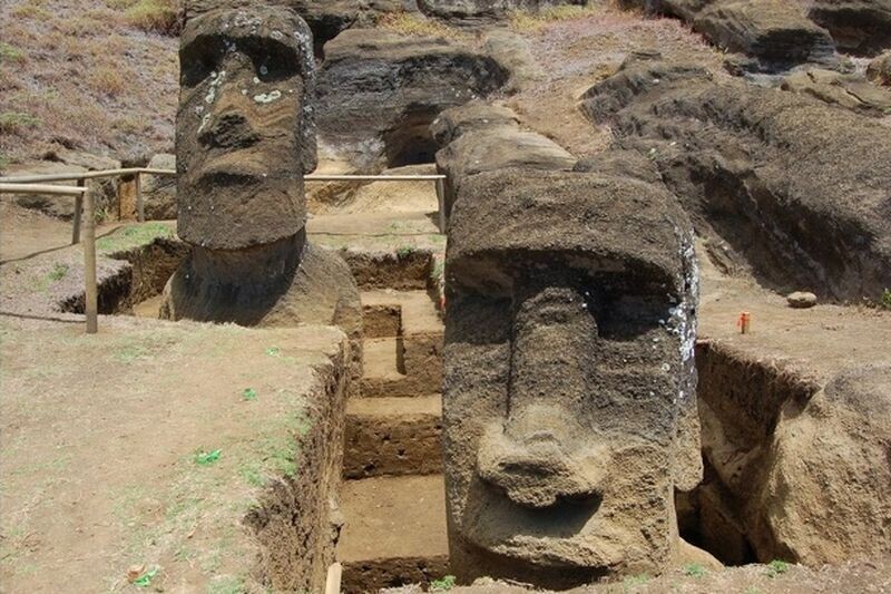 Когда европейские исследователи впервые достигли Рапа-Нуи в пасхальное воскресенье 1722 года, они обнаружили загадочные статуи и цивилизацию, которая уже находилась в упадке. Сейчас на острове насчитывается около 900 каменных статуй моаи, самая большая из которых - Паро имела в высоту около 10 метров и весила более 75 тонн. Подавляющее большинство из них было вырезано из вулканического туфа в карьере Рано-Рараку, где сегодня можно увидеть около 400 статуй на разных стадиях завершения. Моаи характеризуются непропорционально большими головами, составляющими около 3/8 всей статуи, и четко выраженными чертами лица.
