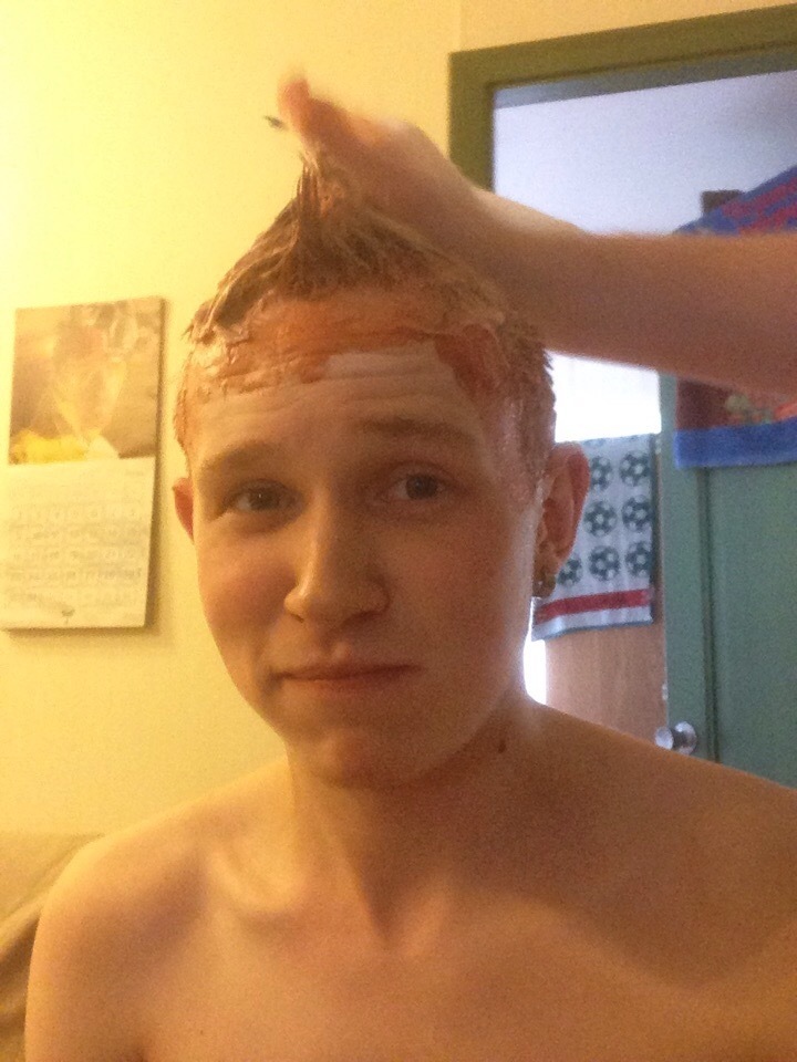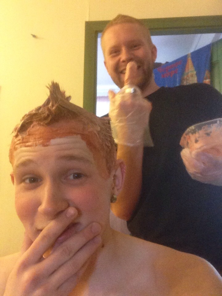 Ну и естественно пруфы на малого, остановились на красном так как, более весёлых цветов в ближайшем магазе с краской для волос не продаётся, я предлагал тиккурилу но её тоже не оказалось ))