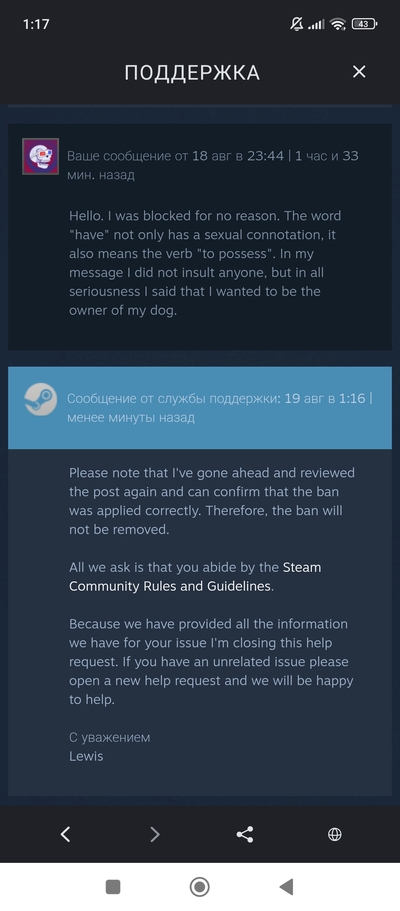 Вы же, наверное, понимаете, что меня по факту забанили ошибочно? Почему я должен сидеть в бане, просто потому что какой-то индус неправильно понял контекст текста?