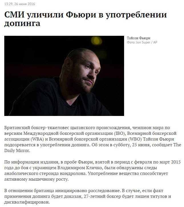 После того как Тайсон Фьюри назвал Владимира Кличко тупым украинским **** [фаллосом] и перенес бой из-за травмы, то СМИ уличили Фьюри в употреблении допинга...
