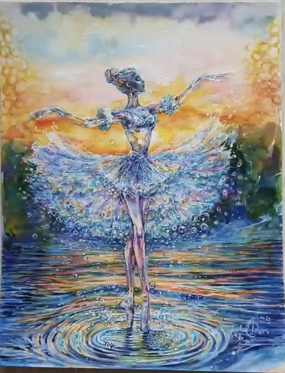 Этот контраст между прозрачной, стеклянной балериной и ярким, насыщенным фоном усиливает впечатление драматизма и эмоциональной глубиным картинв, которую хочется долго рассматривать. Ритм капелек помогает зрителю услышать музыку хрустального звона.