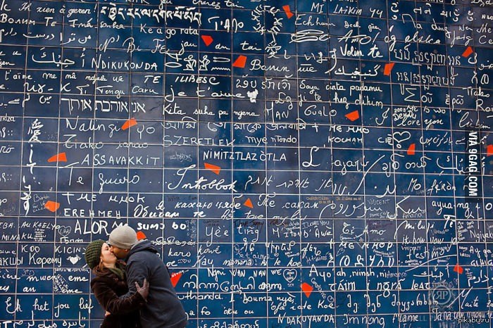 11 x0ma666 «Стена любви» в Париже. 10 лет назад 40 квадратных метров, где написаны слова любви на 311 языках, включая даже шрифт Брайля для слепых. БМ молчал. Стыбжено с 9gag Париж 9GAG Любовь