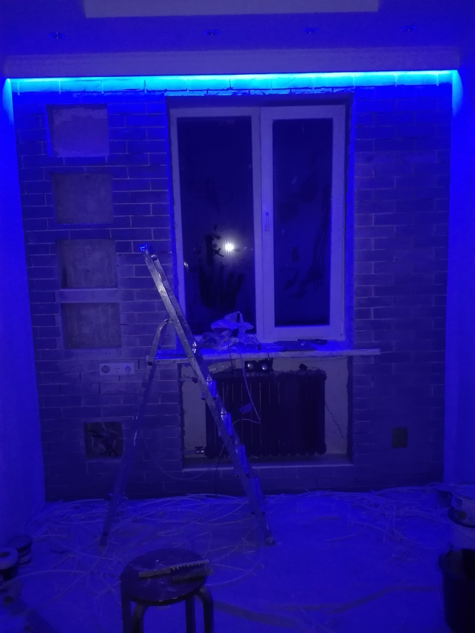 Использовалась обычная уплотнительная лента 8х8мм с клейкой стороной, кое-где прибивал степлером к гипсокартону. Если делать на бетоне, надо очень хорошо грунтовать, ибо отклеивается. В качестве наполнителя КНАУФ гипсовая штукатурка.