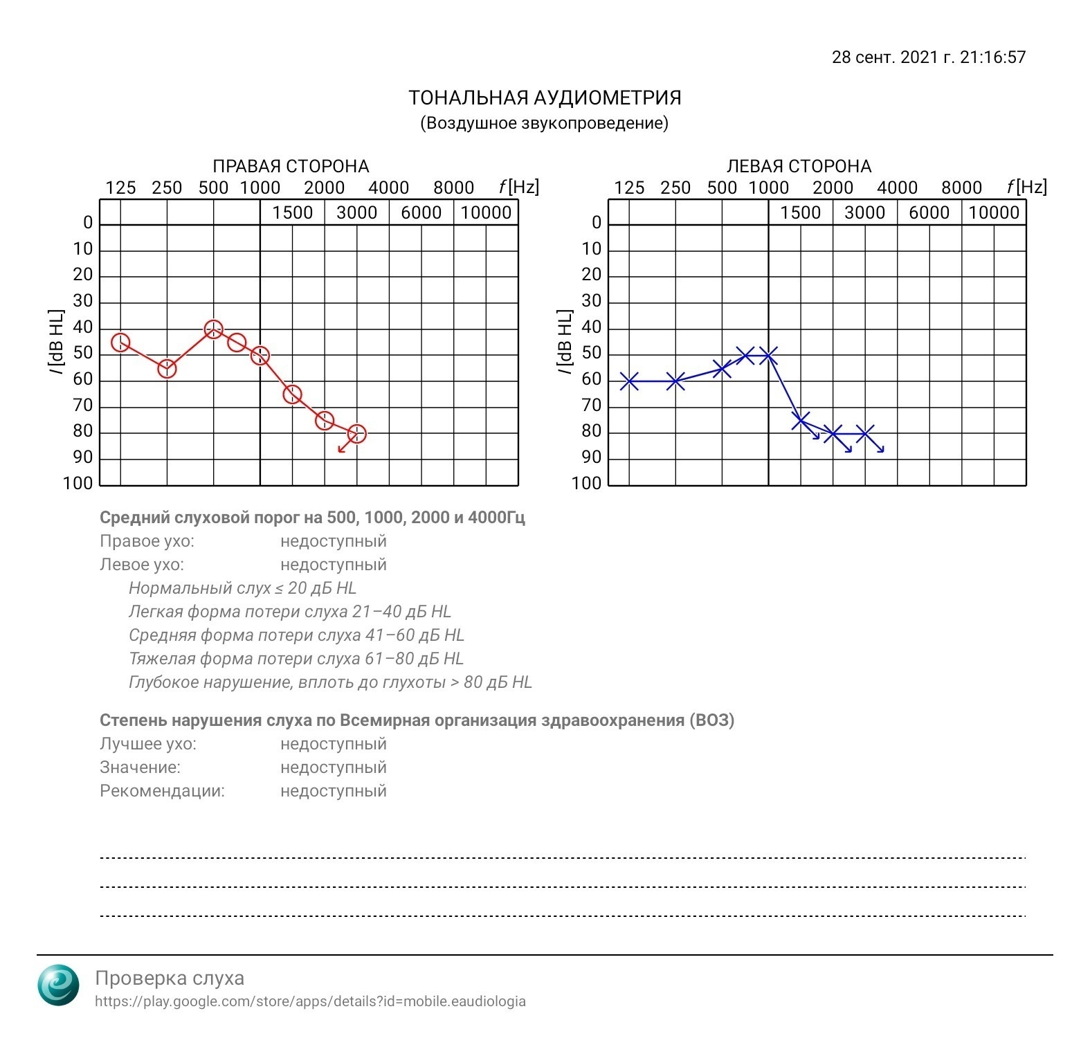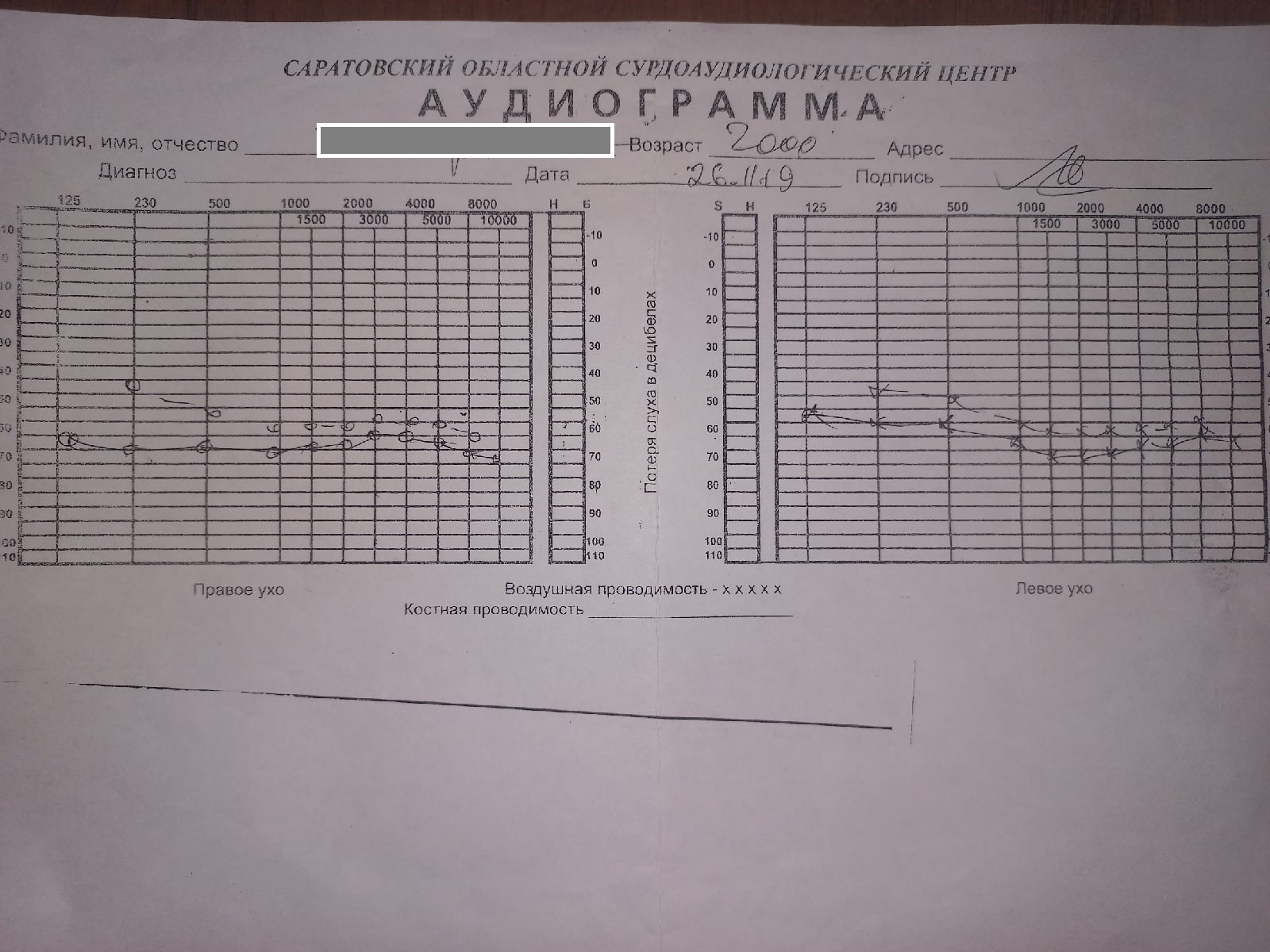 Степень нарушения слуха определяется в ходе специального исследования, пороговой тональной аудиометрии, суть которого состоит в измерении порога (минимальной громкости) восприятия звука по нескольким частотам от 125 Гц до 8 кГц. Если пороги слуха укладываются в диапазон 0-25 дБ, слух считается нормальным.