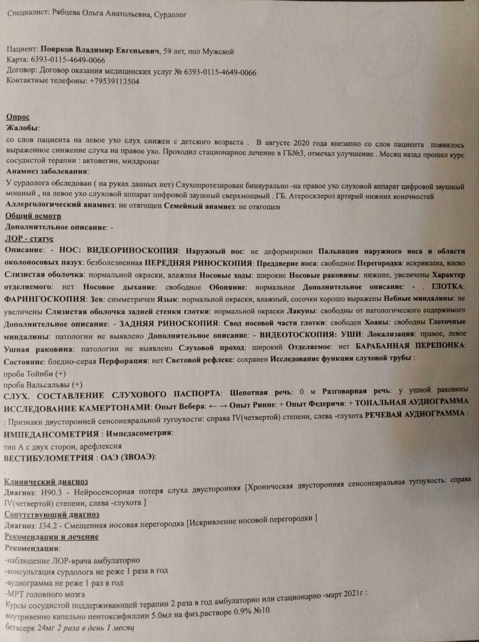 Степень нарушения слуха определяется в ходе специального исследования, пороговой тональной аудиометрии, суть которого состоит в измерении порога (минимальной громкости) восприятия звука по нескольким частотам от 125 Гц до 8 кГц. Если пороги слуха укладываются в диапазон 0-25 дБ, слух считается нормальным.