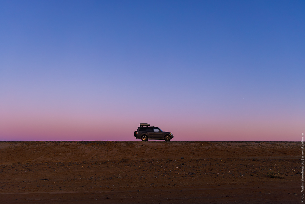 Мы шли по асфальту, хотя и на нем были песчаные переметы. А на данном фото просто ракурс такой) Машина стоит на трассе)