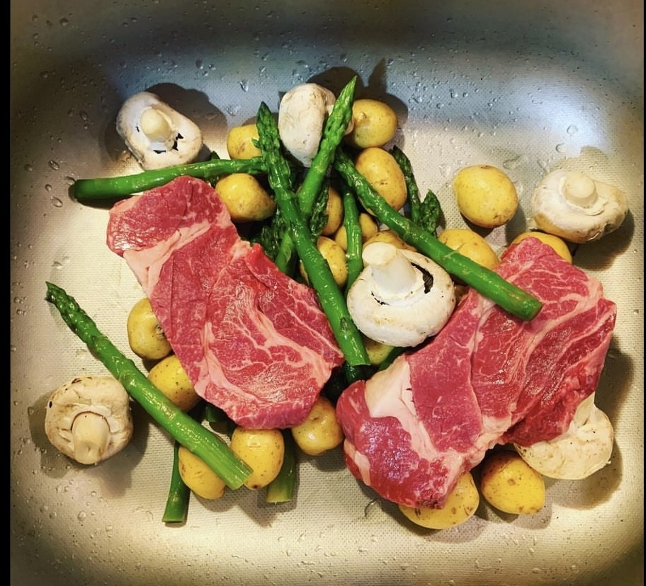 Спаржа, картофель, грибы, чесночное и сливочное масло, размарин, соль, перец!