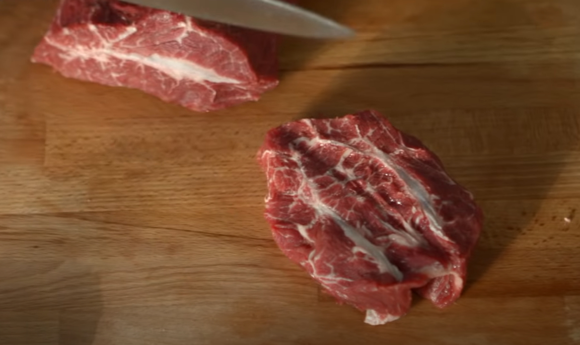 А прожилка - дело десятое, из этого же отруба делают флэт айрон стейки, нарезая тот же кусок вдоль, а не поперёк, и вырезая прожилку. Так что это просто кому какой формат больше нравится.