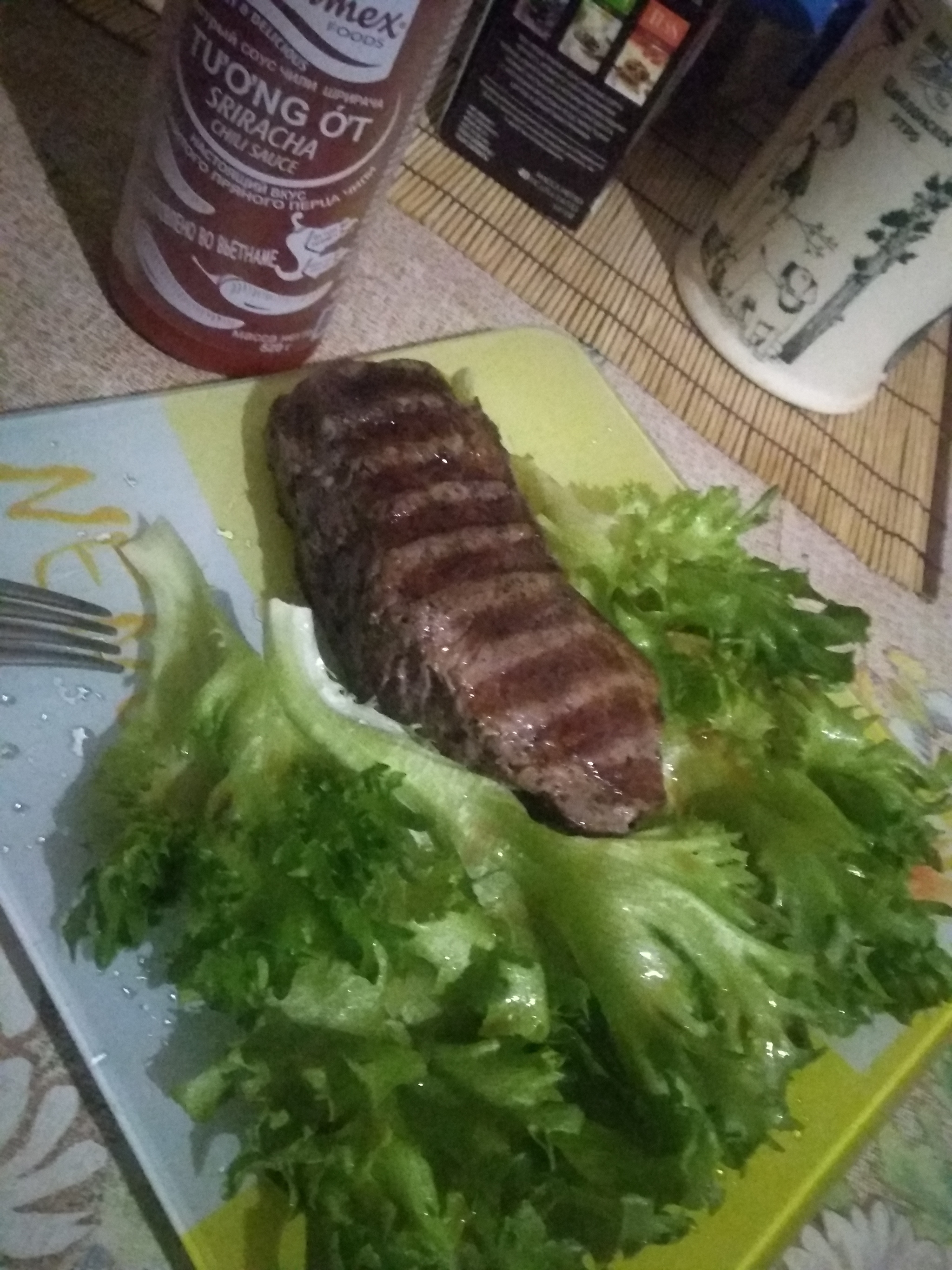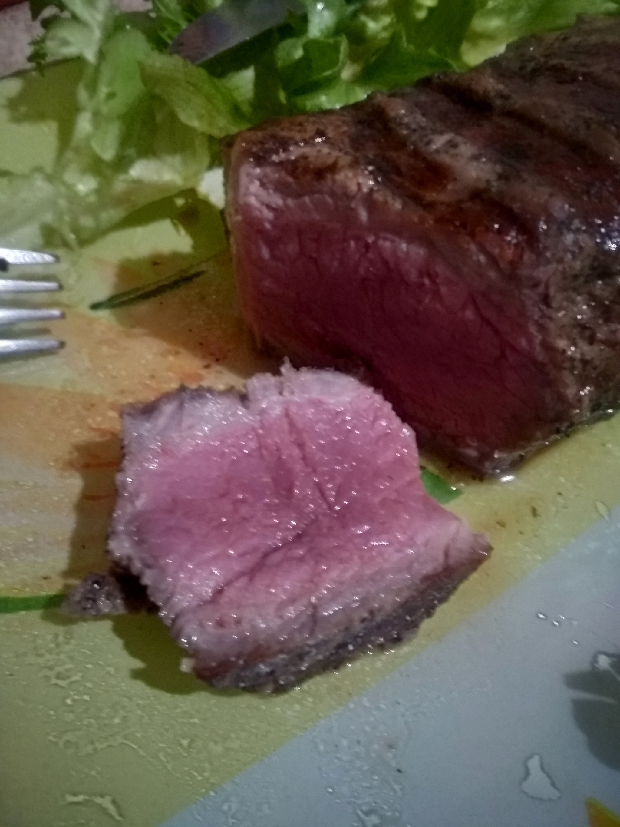 Сам стейк состоит как бы из двух частей, посередине проходит прожилка соединительной ткани, ну а по бокам от неё очень нежное филе.