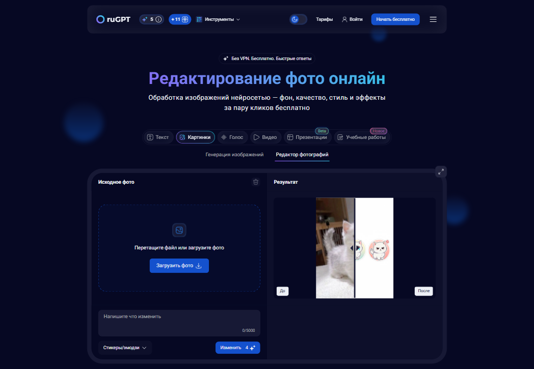ruGPT io — агрегатор нейросетей, объединяющий инструменты для обработки изображений и редактирования контента, позволяющий превратить фото в стикер, удалить фон, улучшить качество, изменить стиль и добавить эффекты прямо в браузере без установки программ.