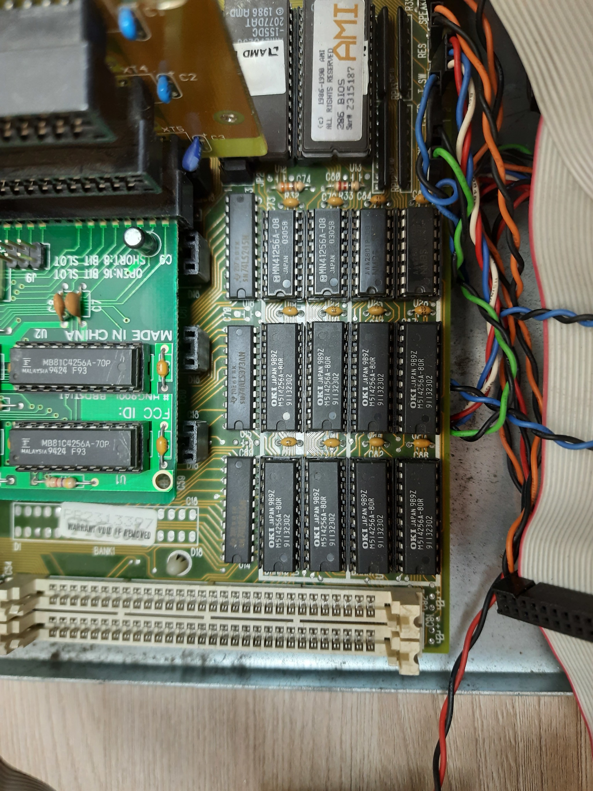 ОЗУ всего 640 кБ, хотя в слоты памяти можно установить до 4 МБ. Память набрана на DIP микросхемах OKI M514256A.