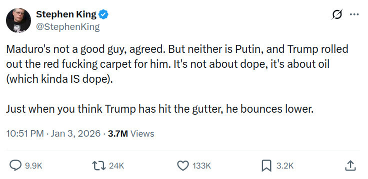 В Америке по поводу Венесуэлы не высказался только ленивый, и убежденный антитрампист Стивен Кинг тоже внес свои 5 центов: