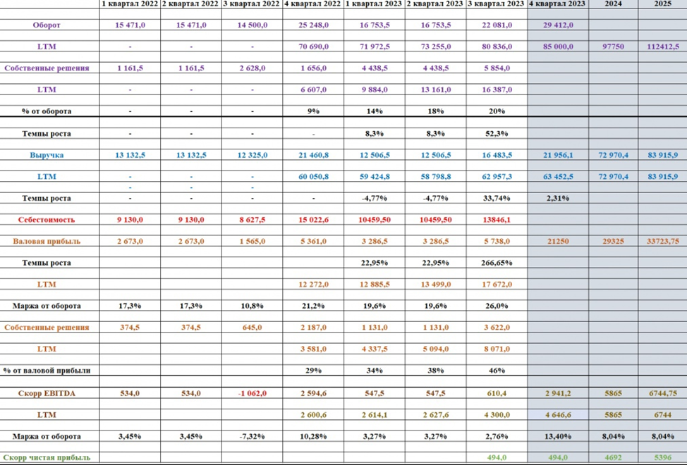 Исходя из прогноза по росту рынка, а также фактор ухода иностранных конкурентов я закладываю рост оборота в 2024 году на уровне 20%, а в 2025 году на уровне 15%.