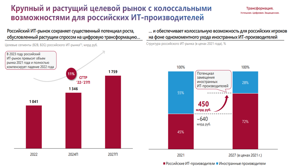Кроме этого, компания будет постепенно отъедать долю ушедших иностранцев, которую оценивают в 450 млрд рублей (25% рынка 2027 года).