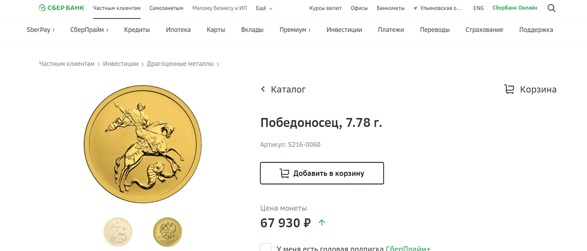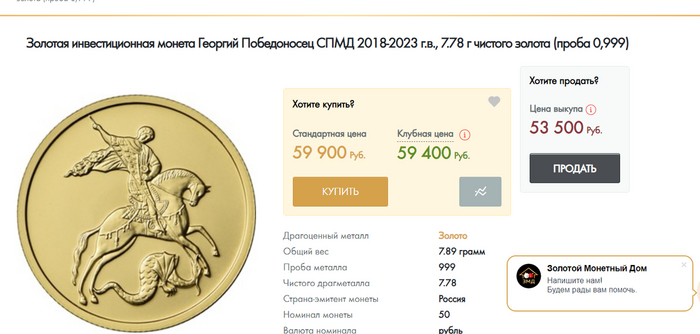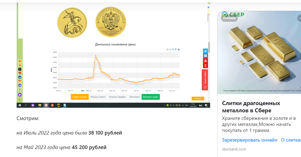 Вот скриншот от мая 2023 года, на нем видно что инвестиционная монета стоила 45 200 рублей.