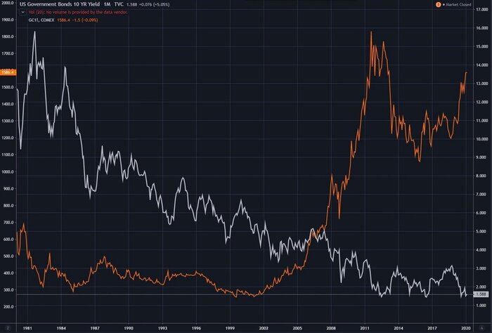 Оранжевая линия -рост стоимости золота, белая снижение доходности облигаций. ( фондовый рынок США, 10-летние облигации)