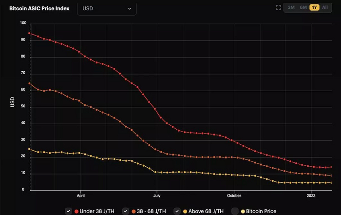 Посмотрев на график стоимости асиков (оборудования для майнинга) с начала 2022 до начала 2023 года, легко понять, насколько сильно упали цены.