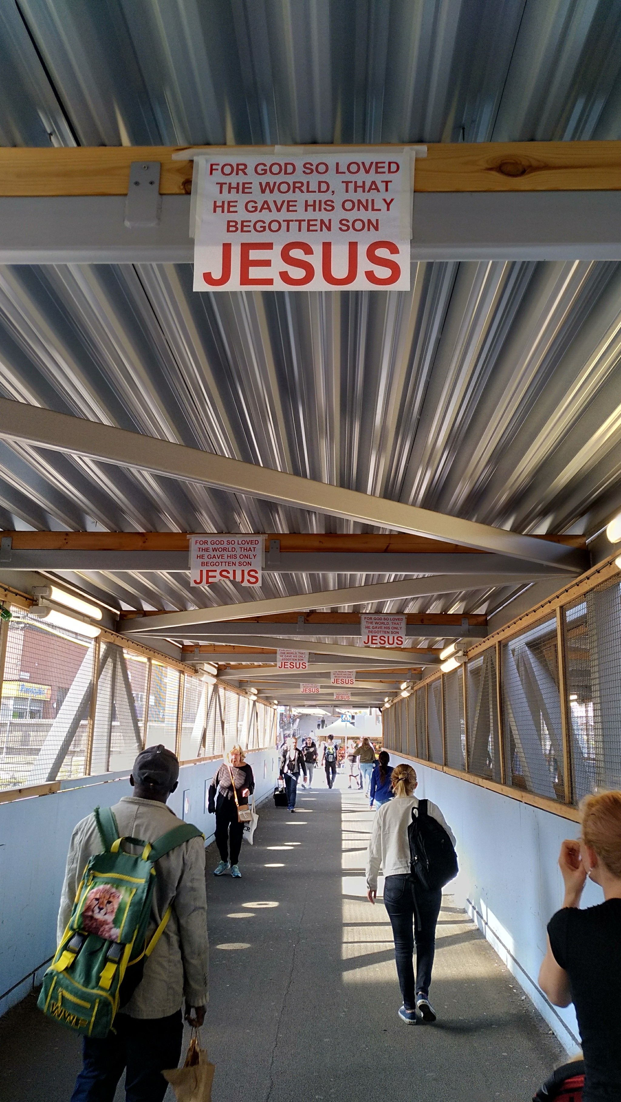Таблички, расположенные под потолком в надземном переходе в Стокгольме.