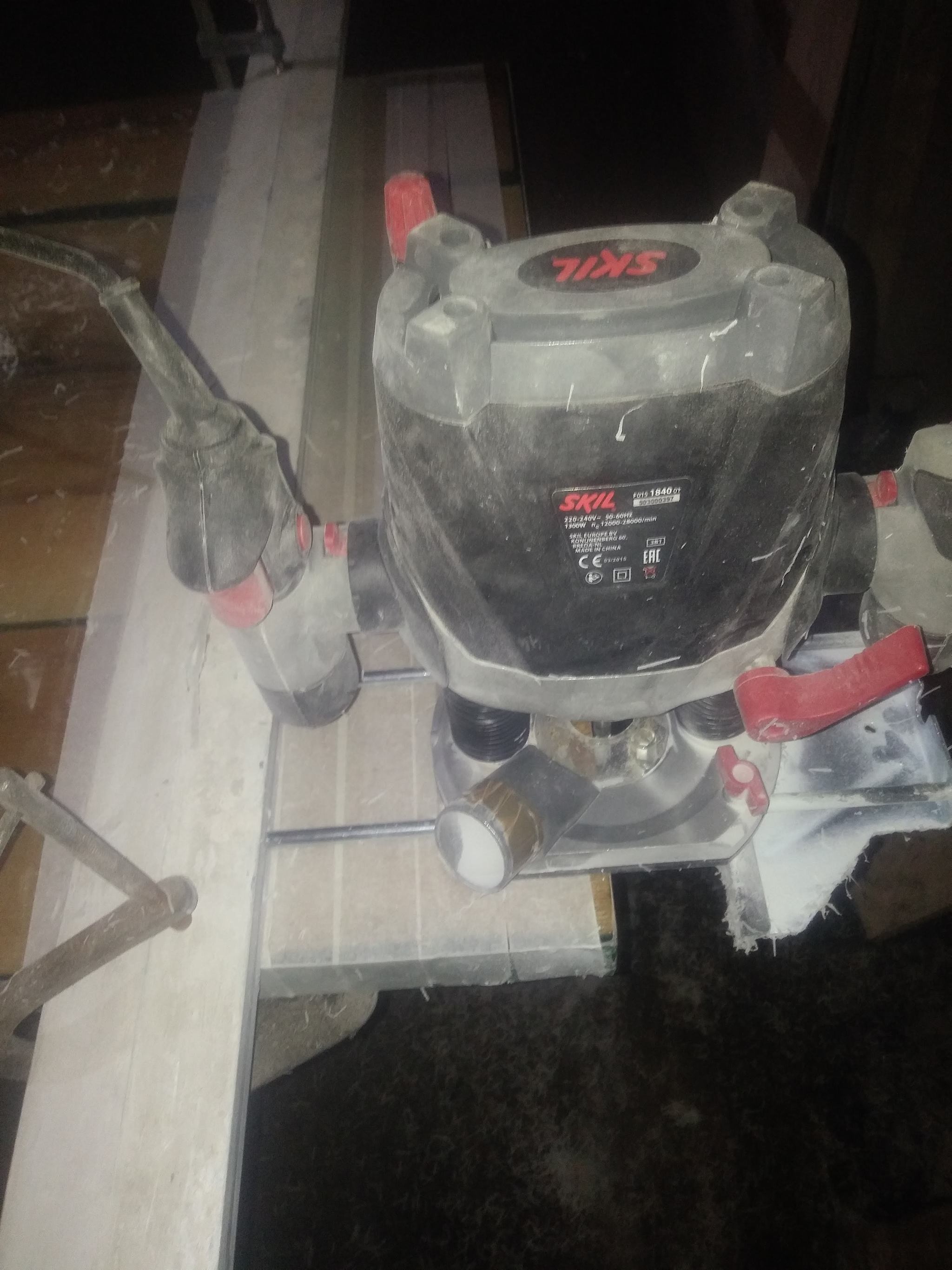 пришлось проходить в два этапа т.к. длинной фрезы хватало только на половину толщины столешницы.