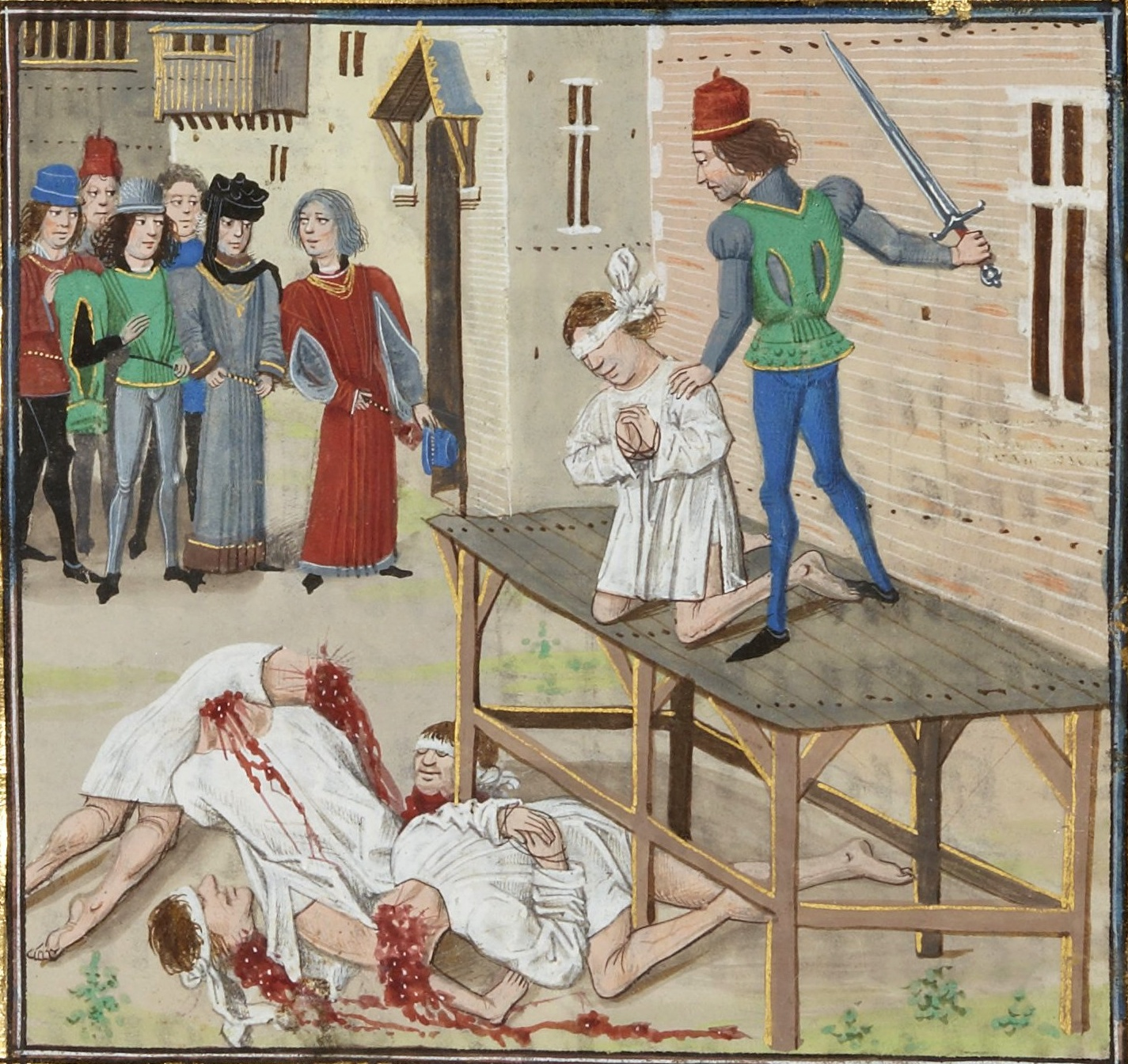 Казнь обвиненных в предательстве Оливье де Клиссона и бретонских рыцарей. Миниатюра из Хроник Фруассара