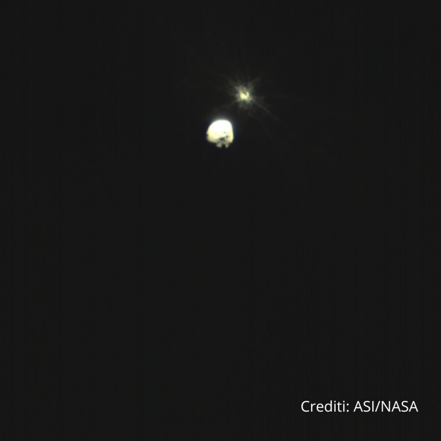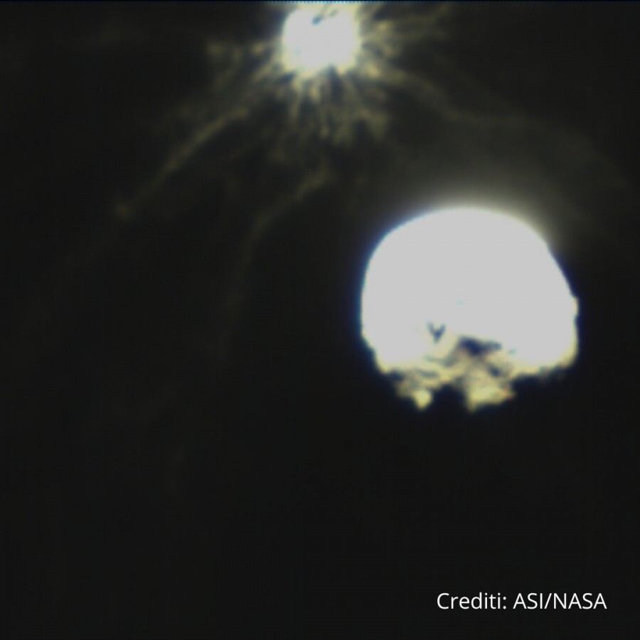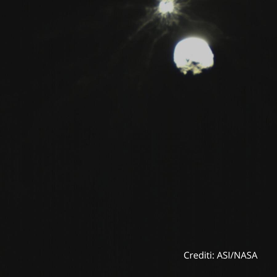 И, наконец, подборка снимков, сделанных итальянским кубсатом LICIACube. Он пролетел на расстоянии 55 км от Диморфма через три минуты после удара. В программу кубсата также входила попытка фотографирования оставшегося кратера, но с учетом количества выброшенного материала не факт, что это у него получилось.
