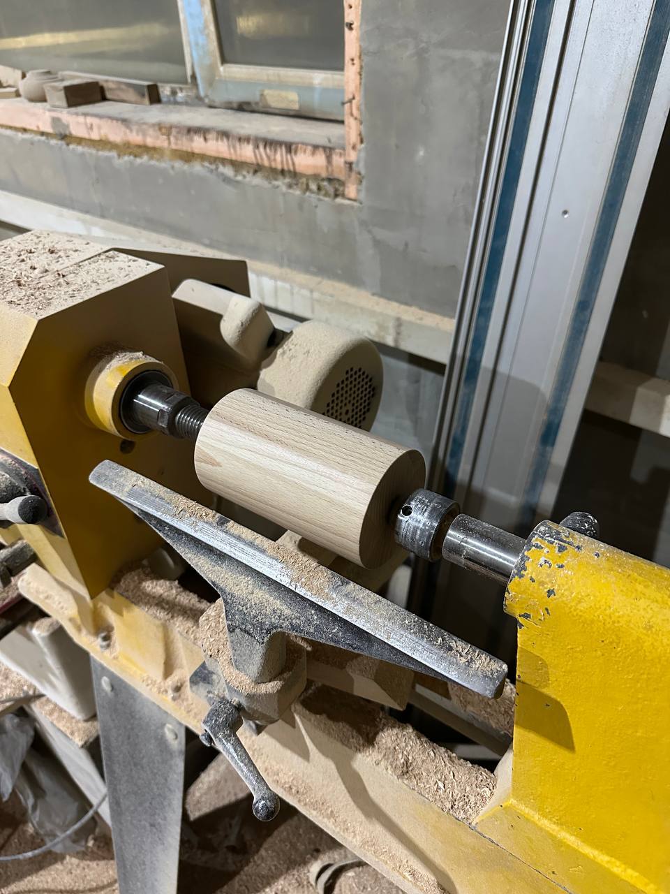 Начать токарные работы я предпочел с шаров. Зажимаем заготовку в станок. При включении эта штука из-за своих габаритов начала работать как вентилятор))