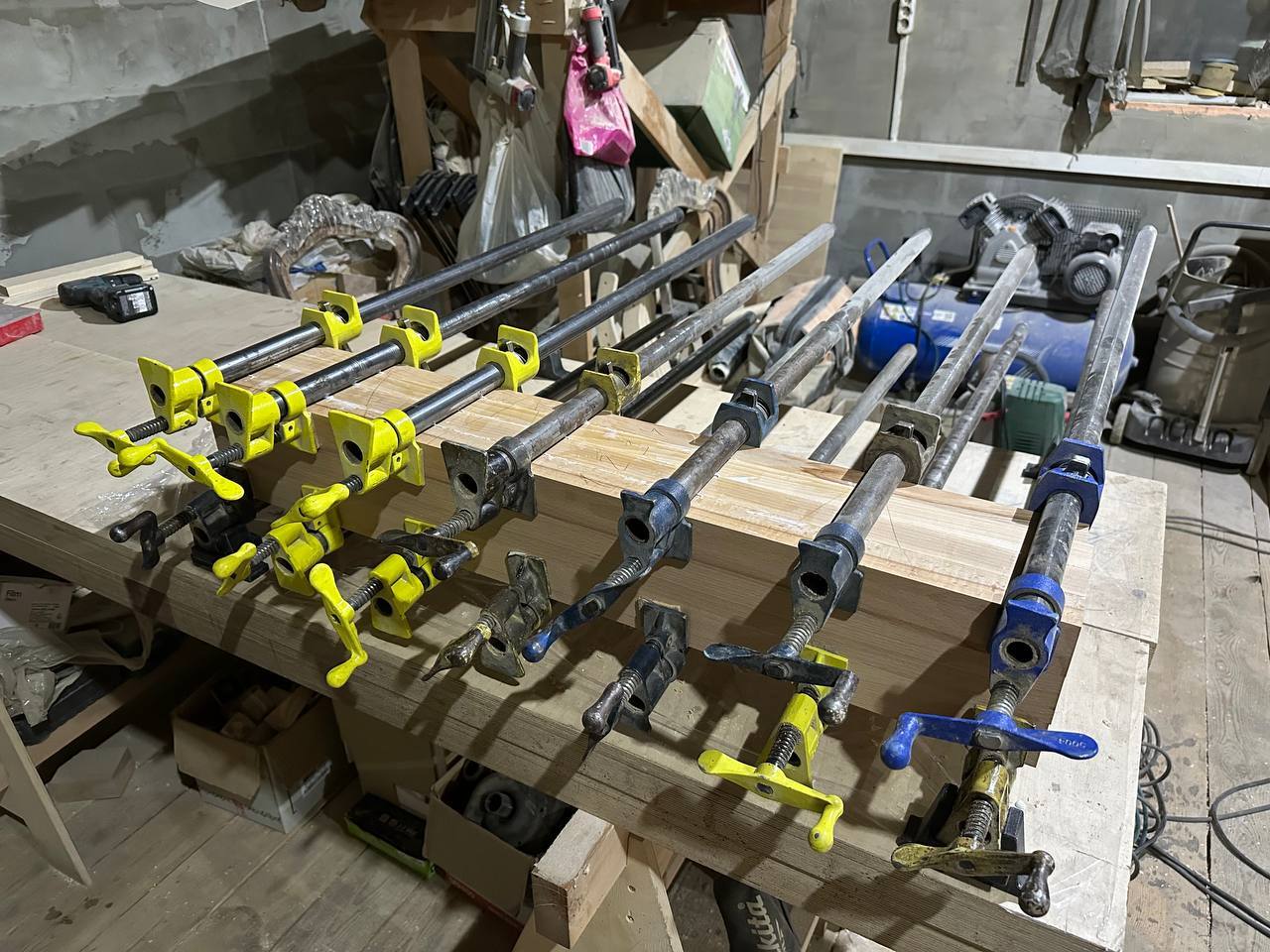 Настрогал ламели, подбираю нужное направление волокон, наношу клей и зажимаю струбцинами. Эти заготовки я оставлю на 24 часа, чтобы клей полностью высох, и можно было продолжить.