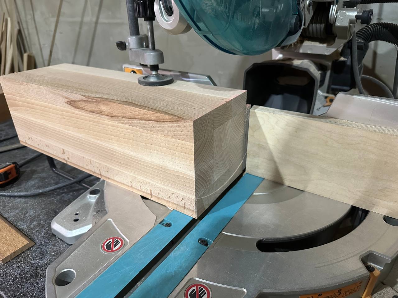 После иду к торцовке - нужно отрезать чуть больше половины, в процессе чуть грущу так как данный инструмент не прохватывает заготовку за раз и приходится пилить с переворотом. Одну часть пока оставляю, а другую калибрую дальше в размер 110*110мм (из этого размера будут делаться куб, призма, цилиндр)