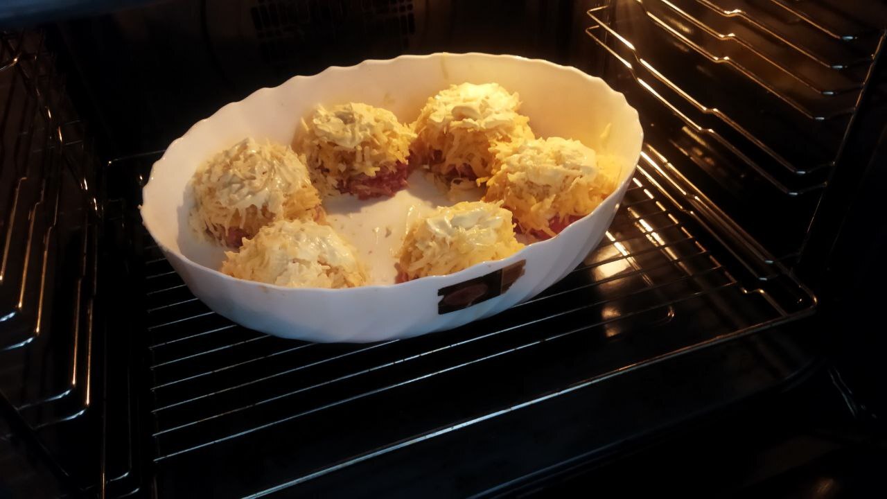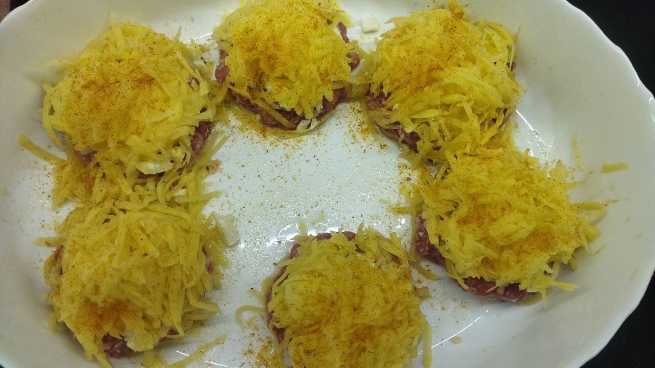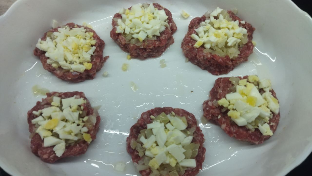1. Добавляем в фарш соль и перец, формируем круглые котлеты с небольшим углублением посередине. Выкладываем на противень, смазанный маслом.