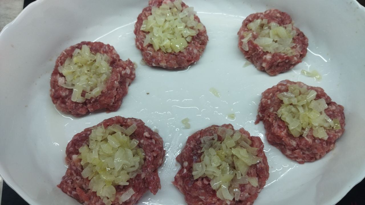 2. Мелко нарезанный лук слегка обжариваем до золотистого цвета, отправляем в центр каждой котлетки.