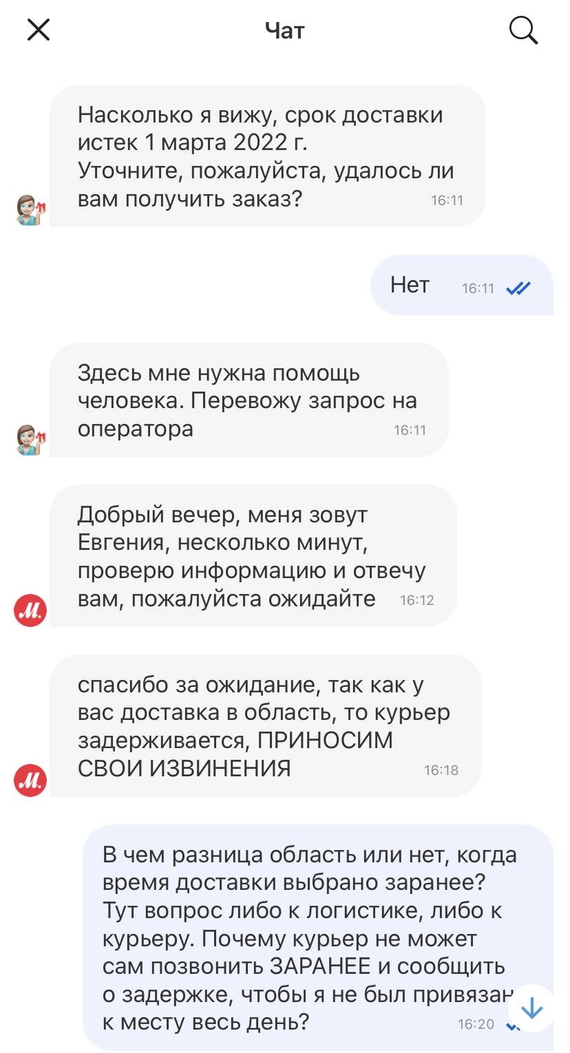 И вот, наконец-то, наступил этот день. Доставка должна была быть с 9 до 16 со звонком от курьера за час, но, как вы наверно уже догадались, ничего не привезли. В 16:10 начал писать в поддержку и вот какой диалог вышел: