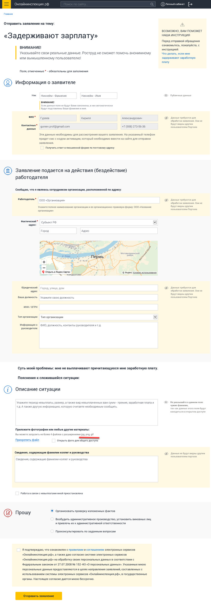 Идён  на их альтернативную систему (https://онлайнинспекция.рф/), Видим "Сообщить о проблеме" - проваливаемся, видим "Заработная плата" - проходим по ссылке, видим "— Задерживают зарплату " - проникаем,  выбираем нужный пункт и жмём "Продолжить". Начинаем заполнять новую форму: