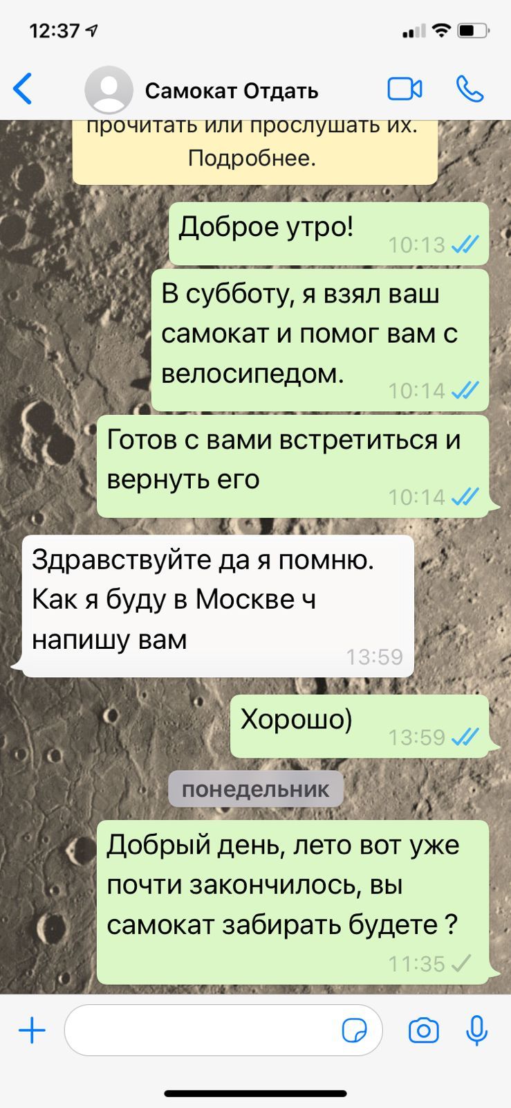 Приехал как то поздно ночью домой, в начале лета. По дороге шла мама, с кучей сумок, самокатом и ребенком на шее. Ей было очень тяжело и неудобно. В итоге она психанула и решила выбросить самокат, а я, как раз, поравнялся с ней и предложил его забрать домой на хранение и отдать когда ей будет удобно. В итоге прошло лето, она не отвечает на ватсап, самокат стоит на балконе.