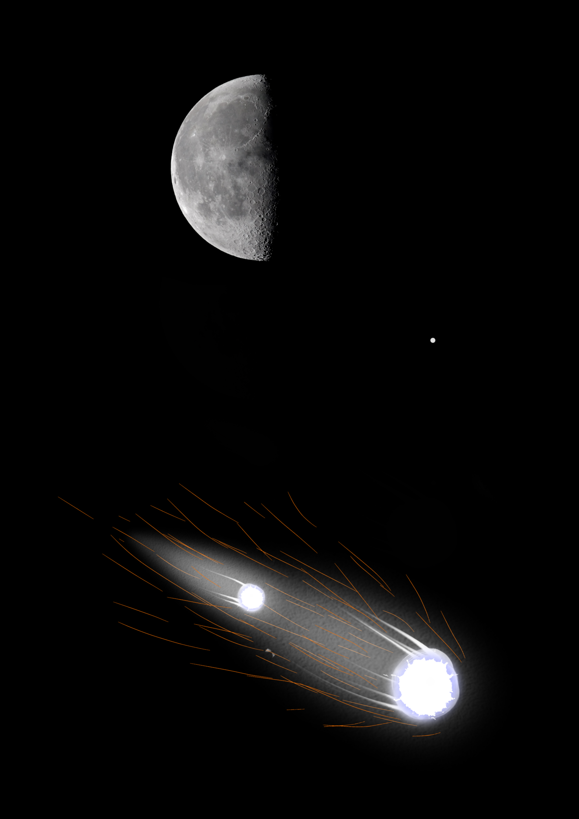 Недавно ночью на звёздном небе увидел необычный падающий объект. Похоже было на метеор но размеры были огромные. Примерно как третья часть месяца: