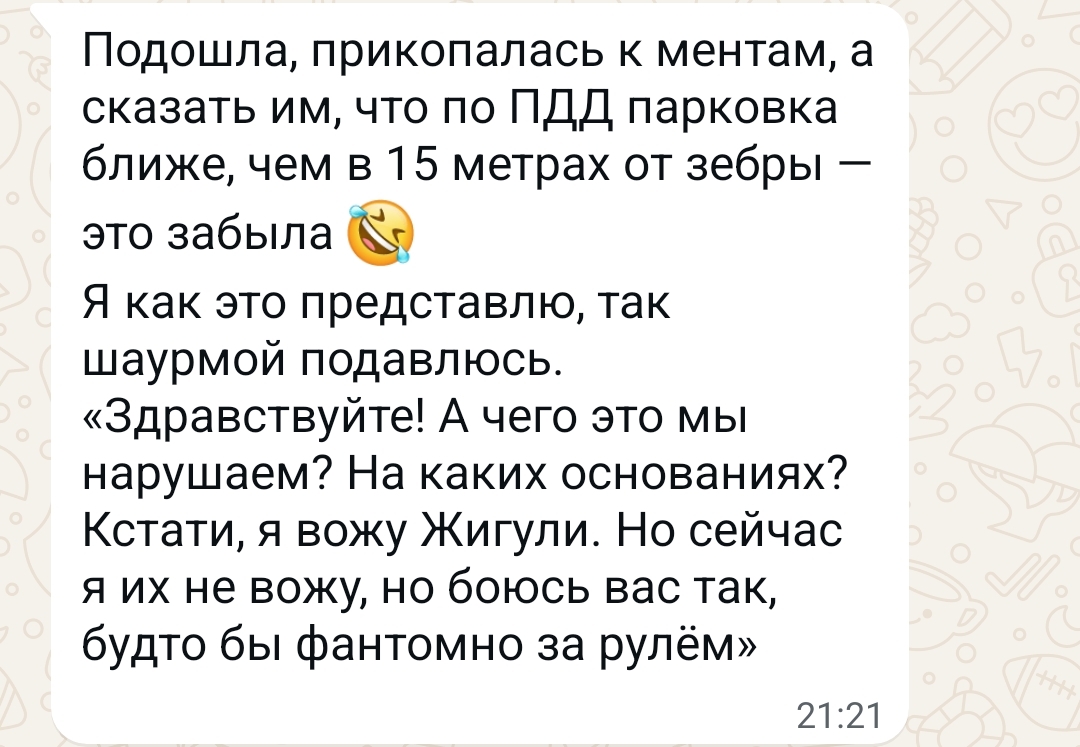 Отошла от них два шага и сзади раздался смех. Страшно мне у них спрашивать, почему они нарушают. Как бы нельзя так парковаться, на автобусной остановке и за 15 метров до нее, если не изменяет память. Да и на перекрёстках и ближе пяти метров от края пересекаемой проезжей части тоже нельзя как бы... Лучшая подруга ответила на эту ситуацию вот так: