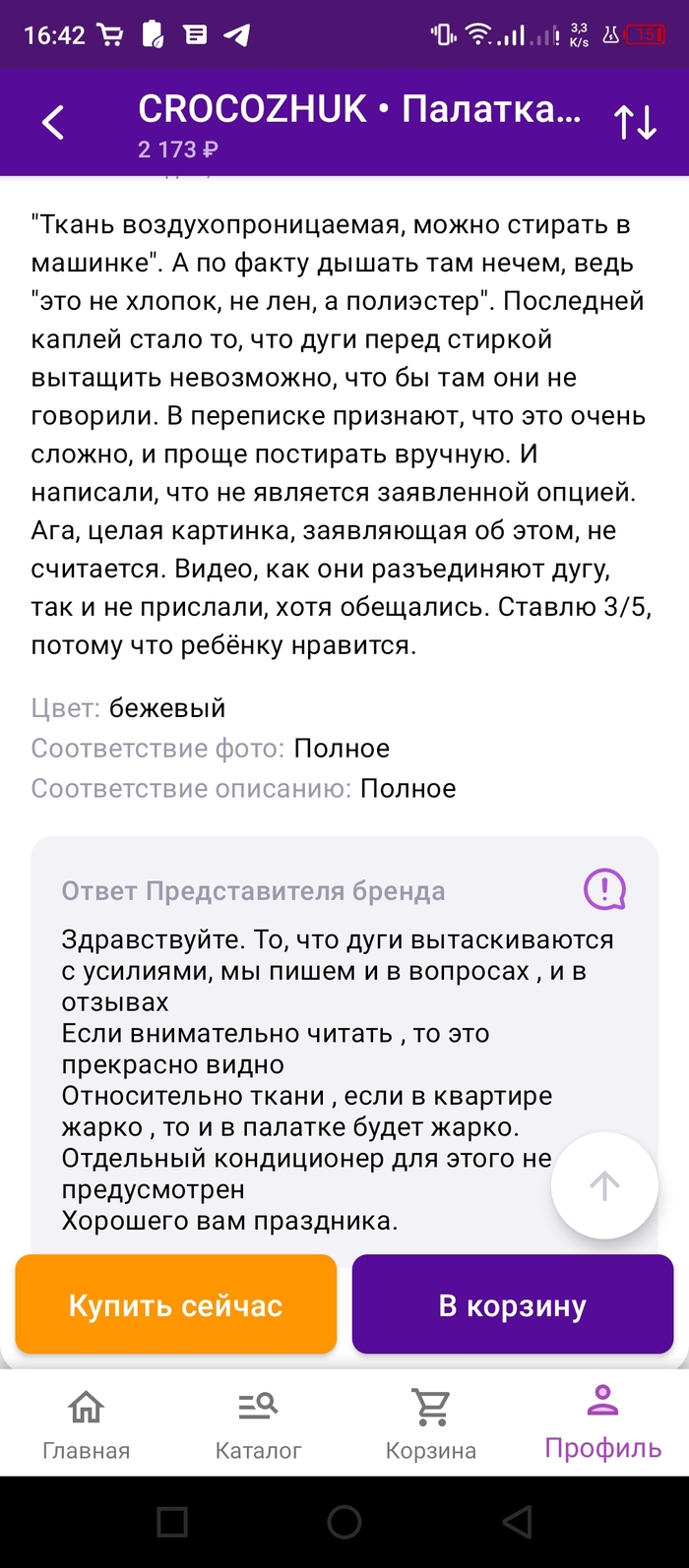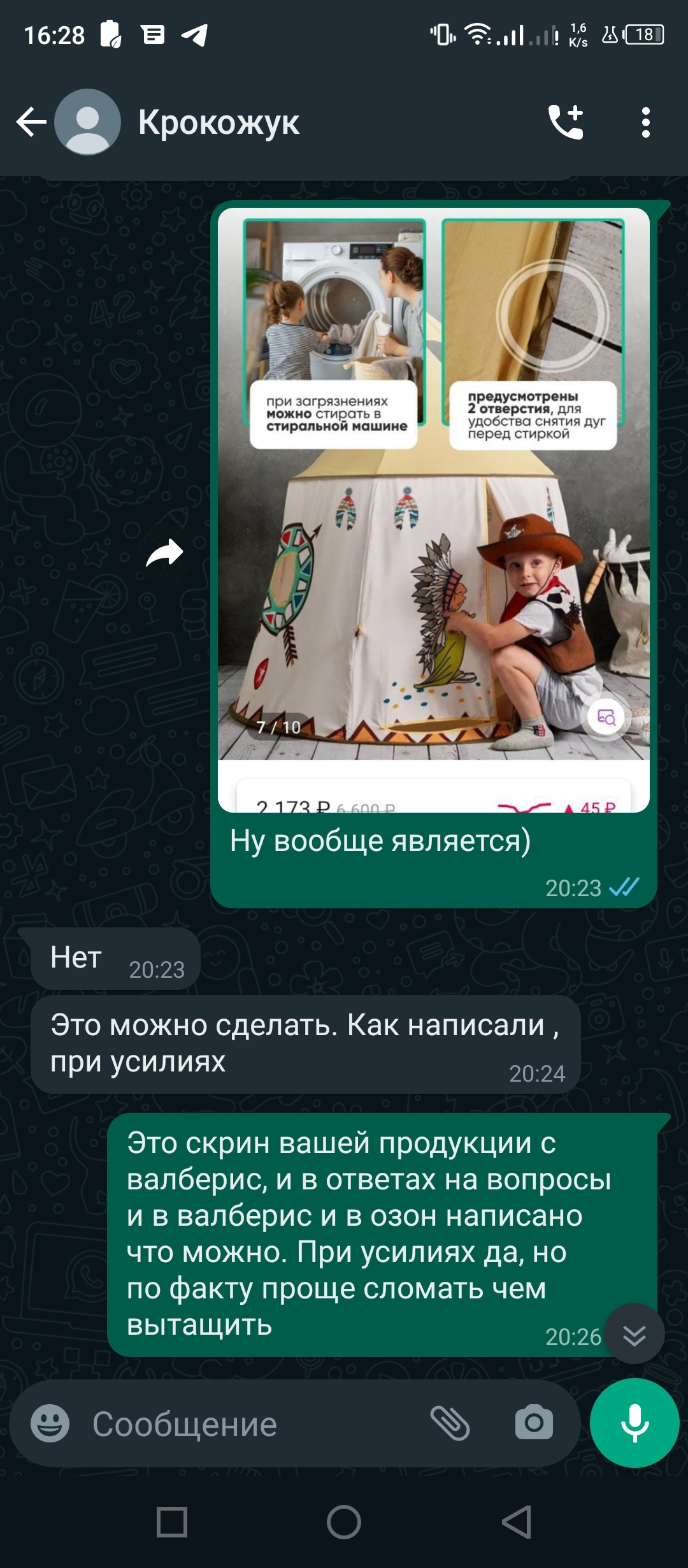 Видео как думаю понятно из скринов, не дождался. Написали отзыв, где собственно все описали и о чудо! Тут же пришел ответ там и в ватсапе. Странно что они отличаются правда? В общем ребята решили забить на собственное обещание. Пост пишу как предупреждение что компания Crocozhuk, продающие детские товары как минимум не совсем честна. Палатка не говно, ребенок рад, но и от заявленного качества, функций отличается явно. А поддержка просто высший пилотаж)