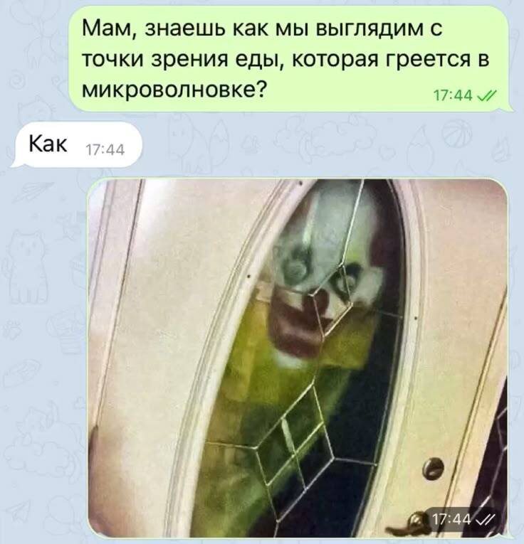 15 eckleer070brek Юмор для всех и каждого Страшно... 2 месяца назад Юмор Картинка с текстом Жизнь Скриншот Переписка Странный юмор Диалог Пеннивайз 2 1 Ещё 0