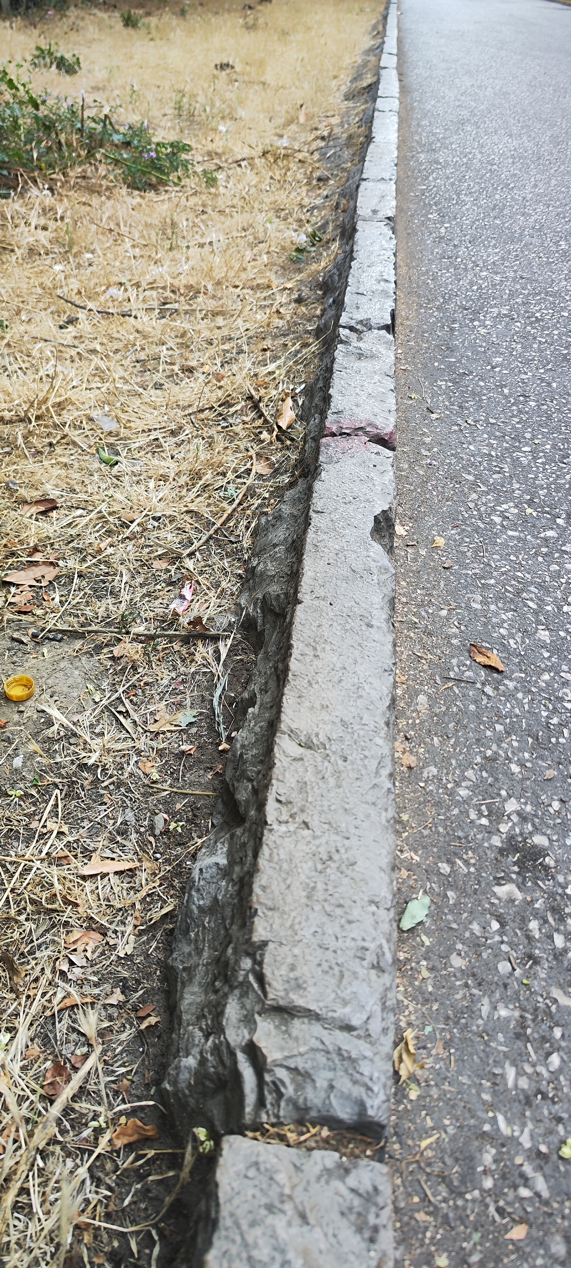 Гуляем в Ялте по улице Чехова. Здесь вдоль тротуара уложены каменные бордюры, которые выровнены каменотёсами только сверху и со стороны дороги. Такое ощущение, что бордюрам не менее 100 лет, но их никто менять не планирует. Свою функцию бордюры выполняют, а сколы камня в некоторых местах подмазаны раствором. Они придают городу неповторимый шарм старины. Многие скажут, что здесь нет зимы и нет необходимости менять зимние бордюры на летние.