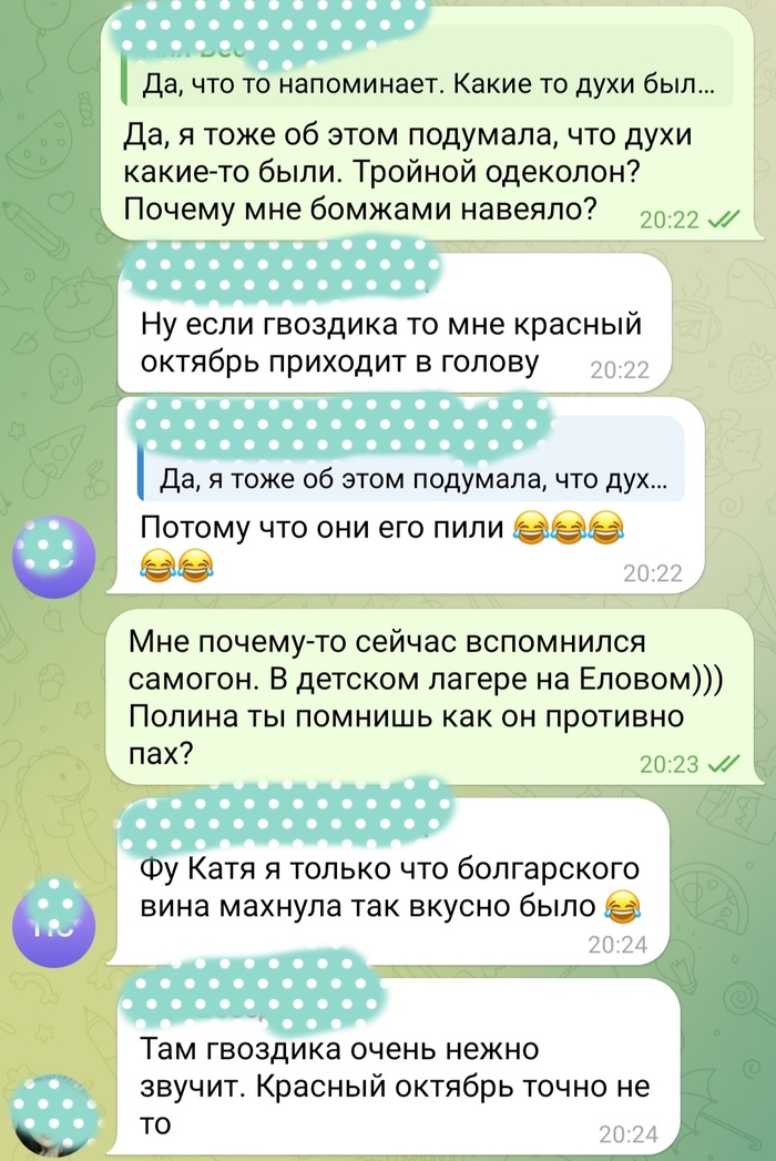 Нас в чате четверо немолодых дам, одна из которых давно покинула пределы этого прекрасного города, в честь которого назван парфюм. Ну а мы трое здесь, в Челябинске.